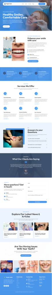 Bright Smiles Dental Clinic is a modern dental practice focused on delivering high-quality, patient-centered care. The website was designed to reflect trust, comfort, and professionalism while showcasing services such as preventive, cosmetic, and restorative dentistry. With a clean layout, clear navigation, and welcoming visuals, the platform enhances user experience and encourages patients to book appointments with confidence.