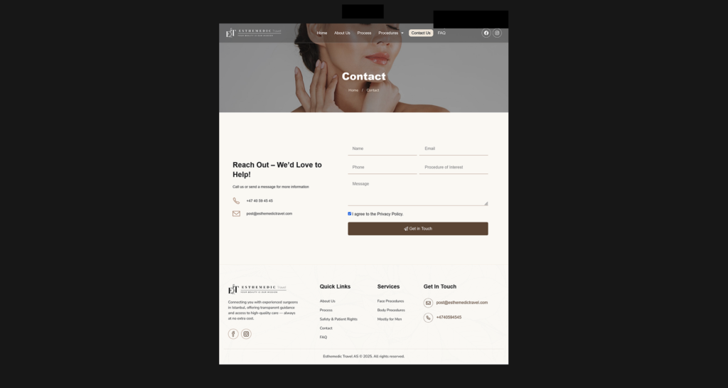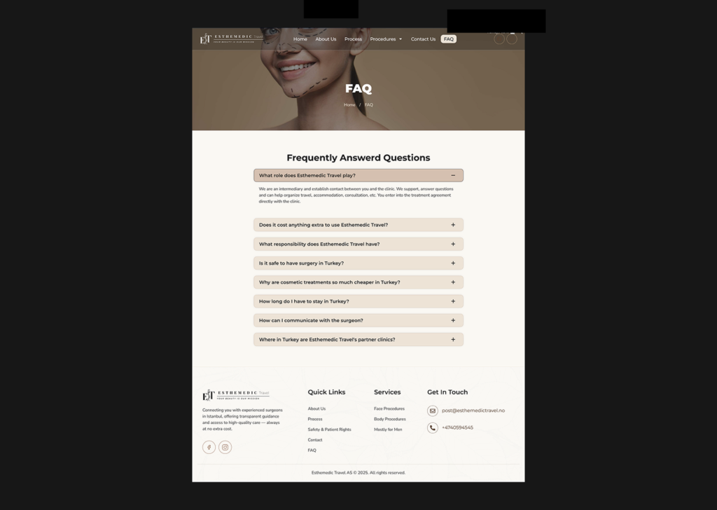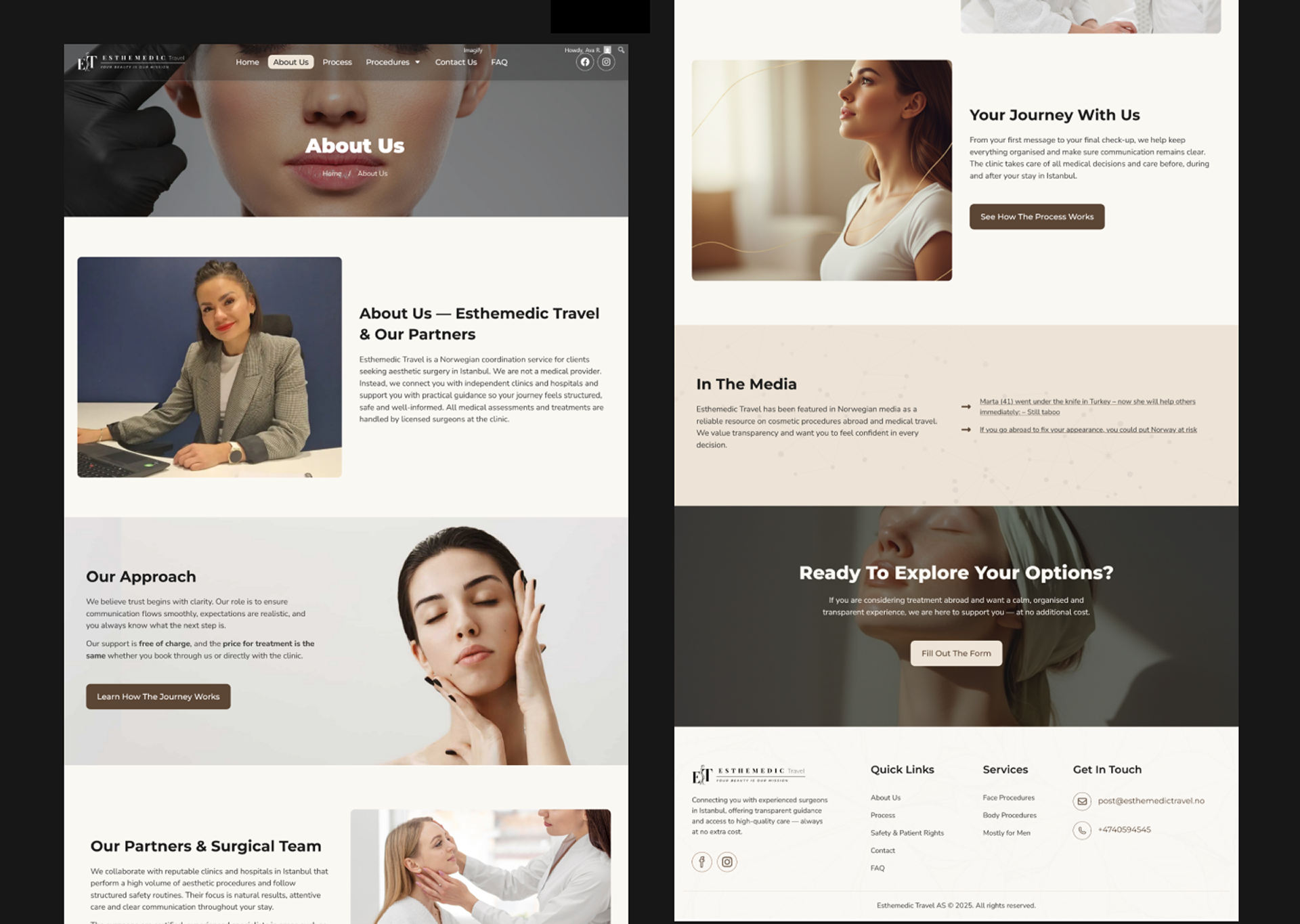 Esthemedic Travel connects Norwegian clients with top-tier, independent cosmetic surgery clinics and hospitals in Turkey. We understand that choosing treatment abroad can feel overwhelming, which is why we provide calm, transparent guidance throughout your journey—always at no extra cost to you. All medical assessments and treatments are carried out solely by licensed surgeons at the clinic, ensuring your safety, confidence, and peace of mind every step of the way.