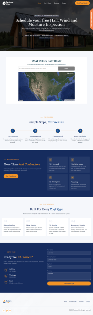 Restore Link is a restoration service platform that helps homeowners in Orlando, FL handle property damage through their insurance. The website guides users from damage assessment to inspection and repair, making it easy to understand the process and take action with a free evaluation.