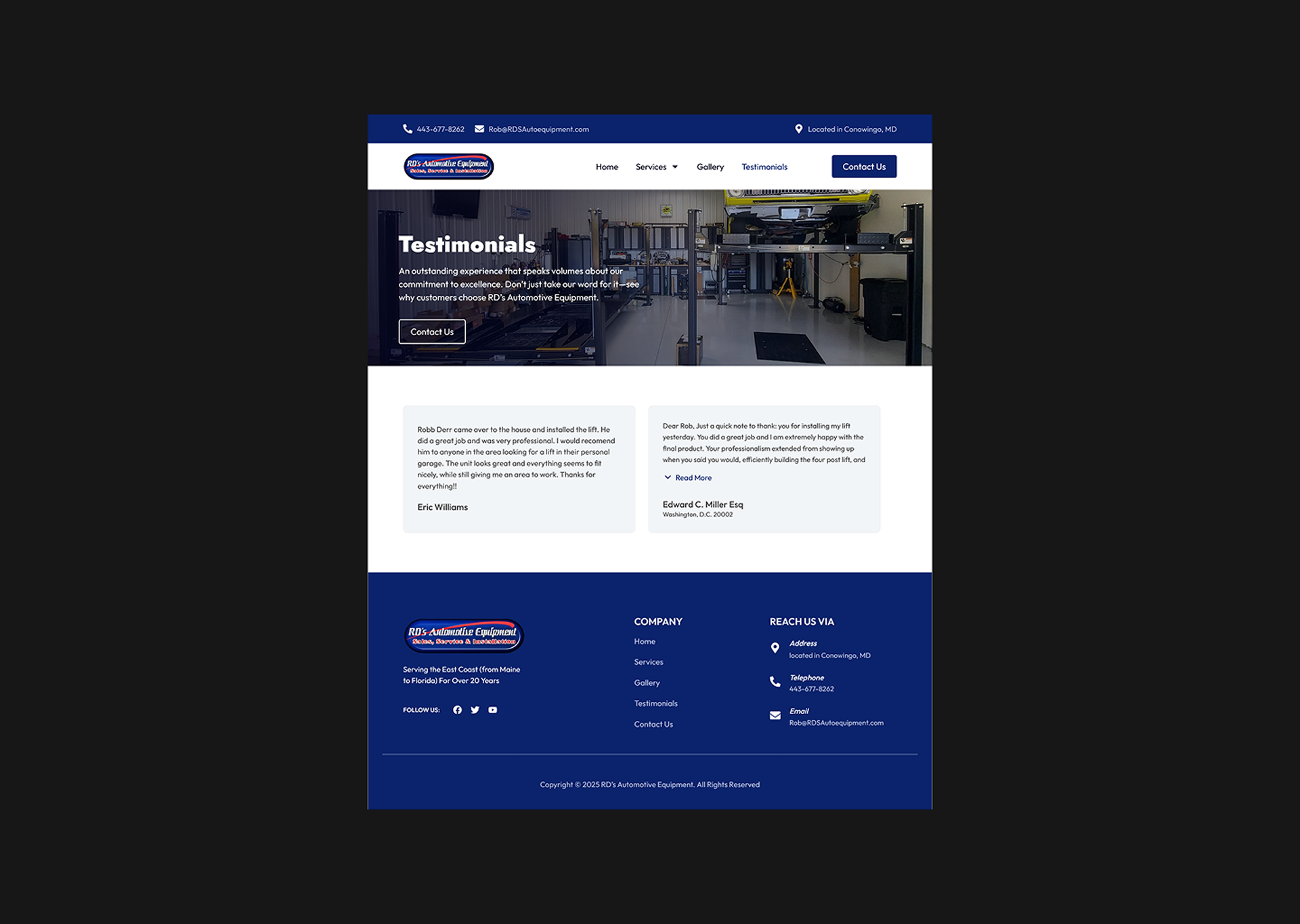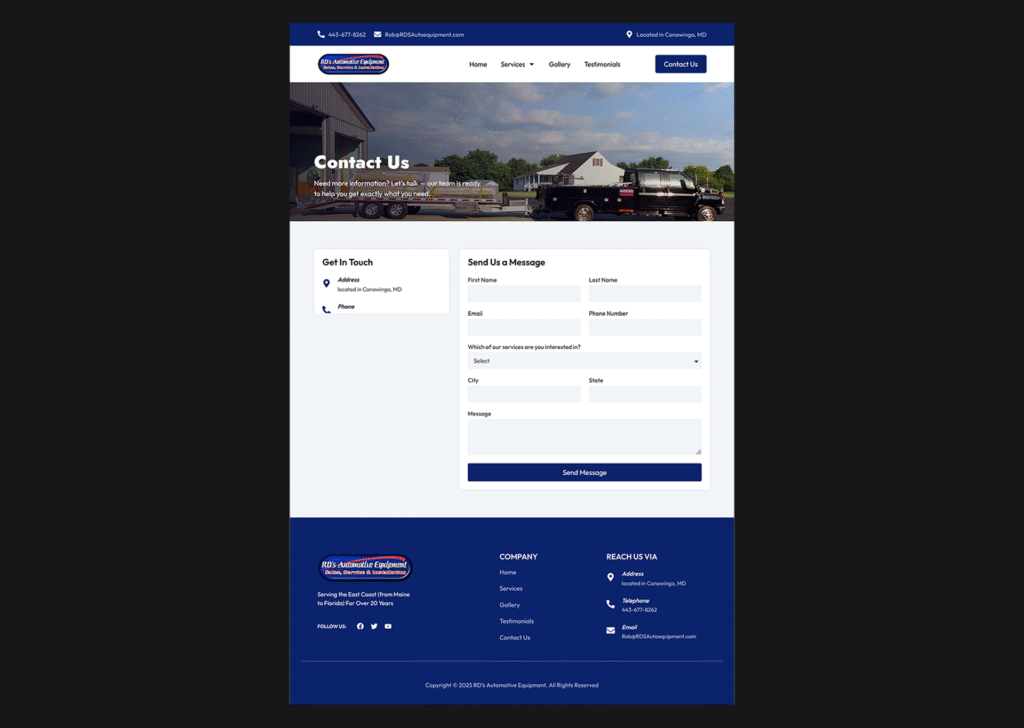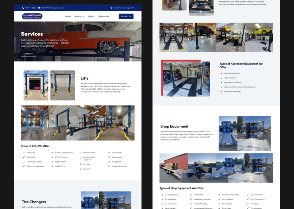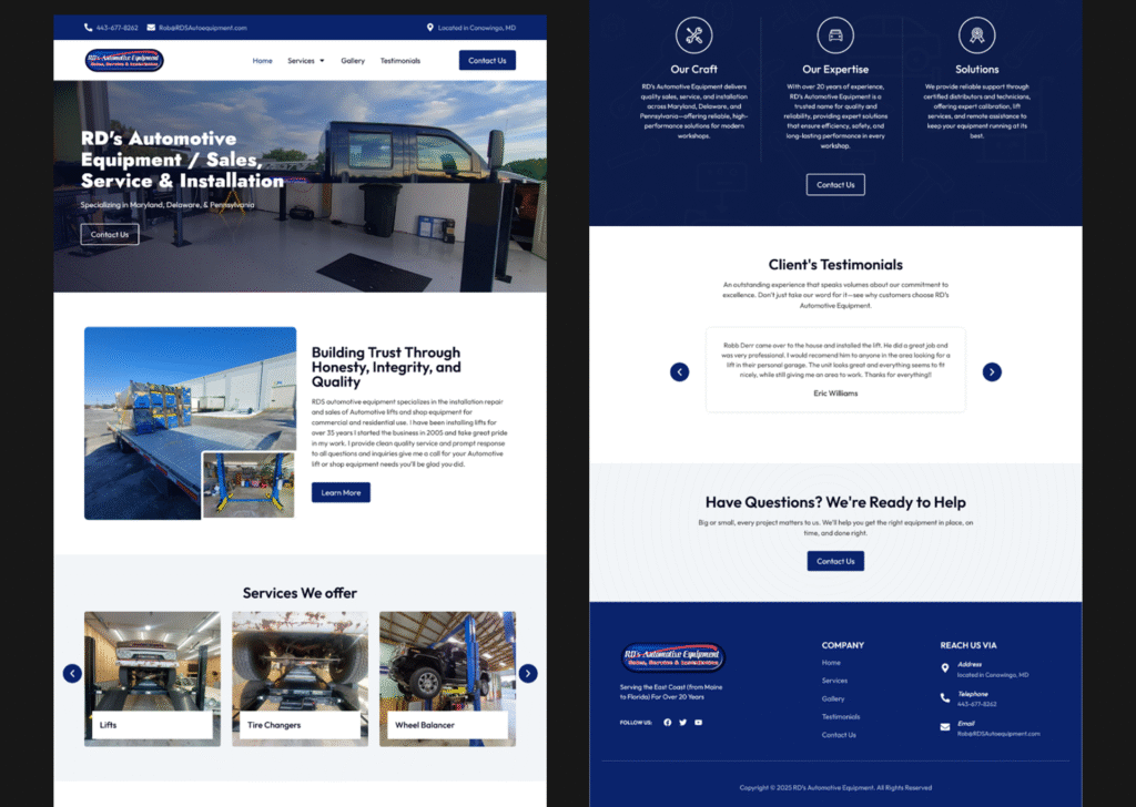 Description: RD’s Automotive Equipment is a trusted automotive solutions brand specializing in sales, service, and installation of workshop equipment. I designed their digital presence to reflect reliability, precision, and industry expertise — showcasing their commitment to quality and long-term performance across Maryland, Delaware, and Pennsylvania.