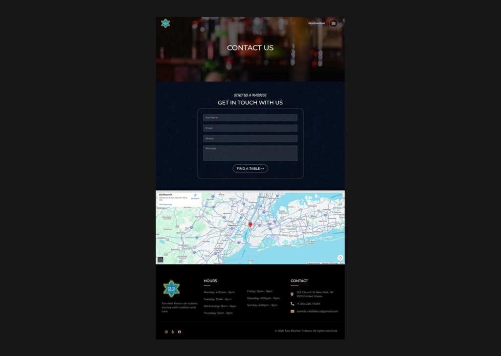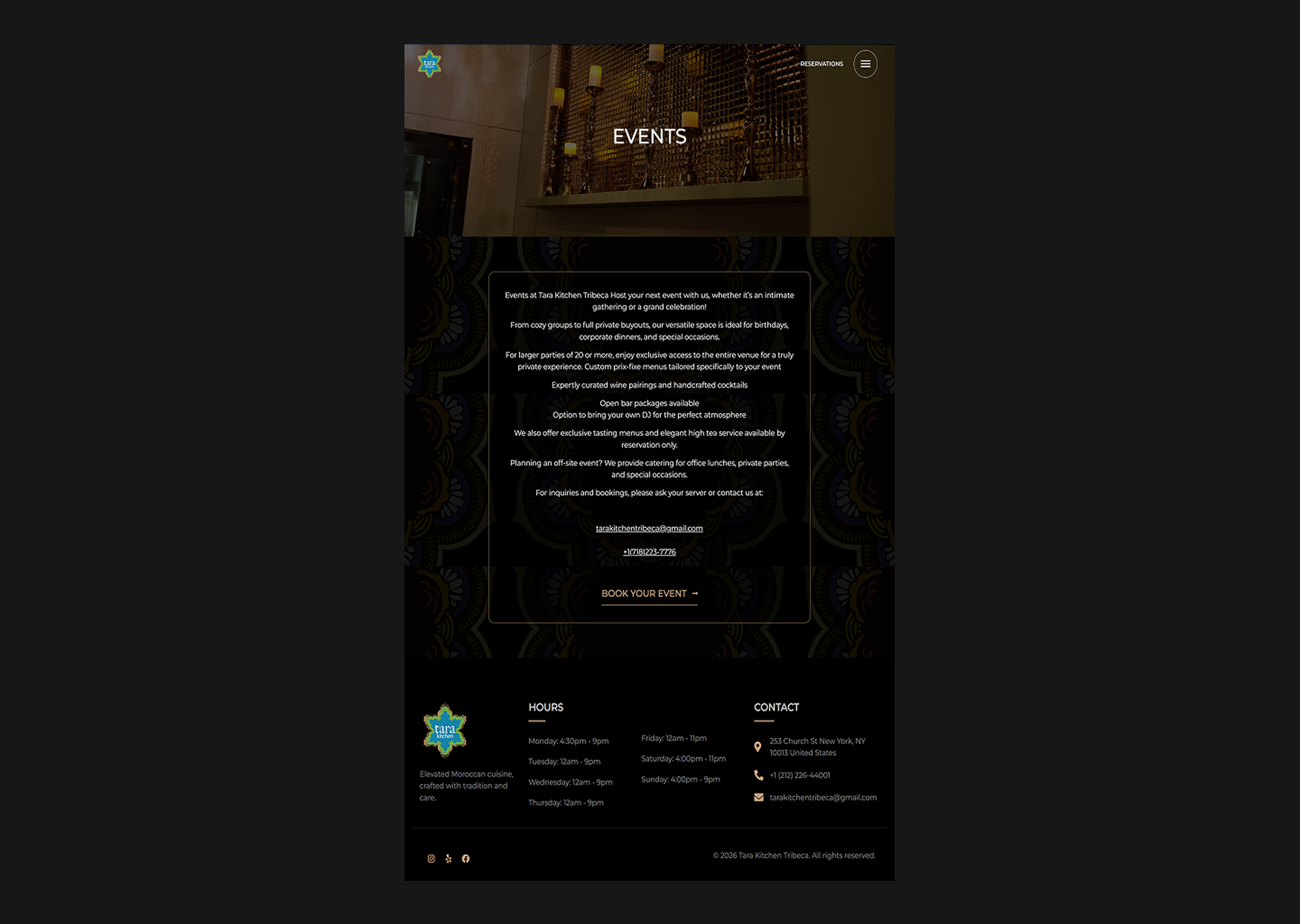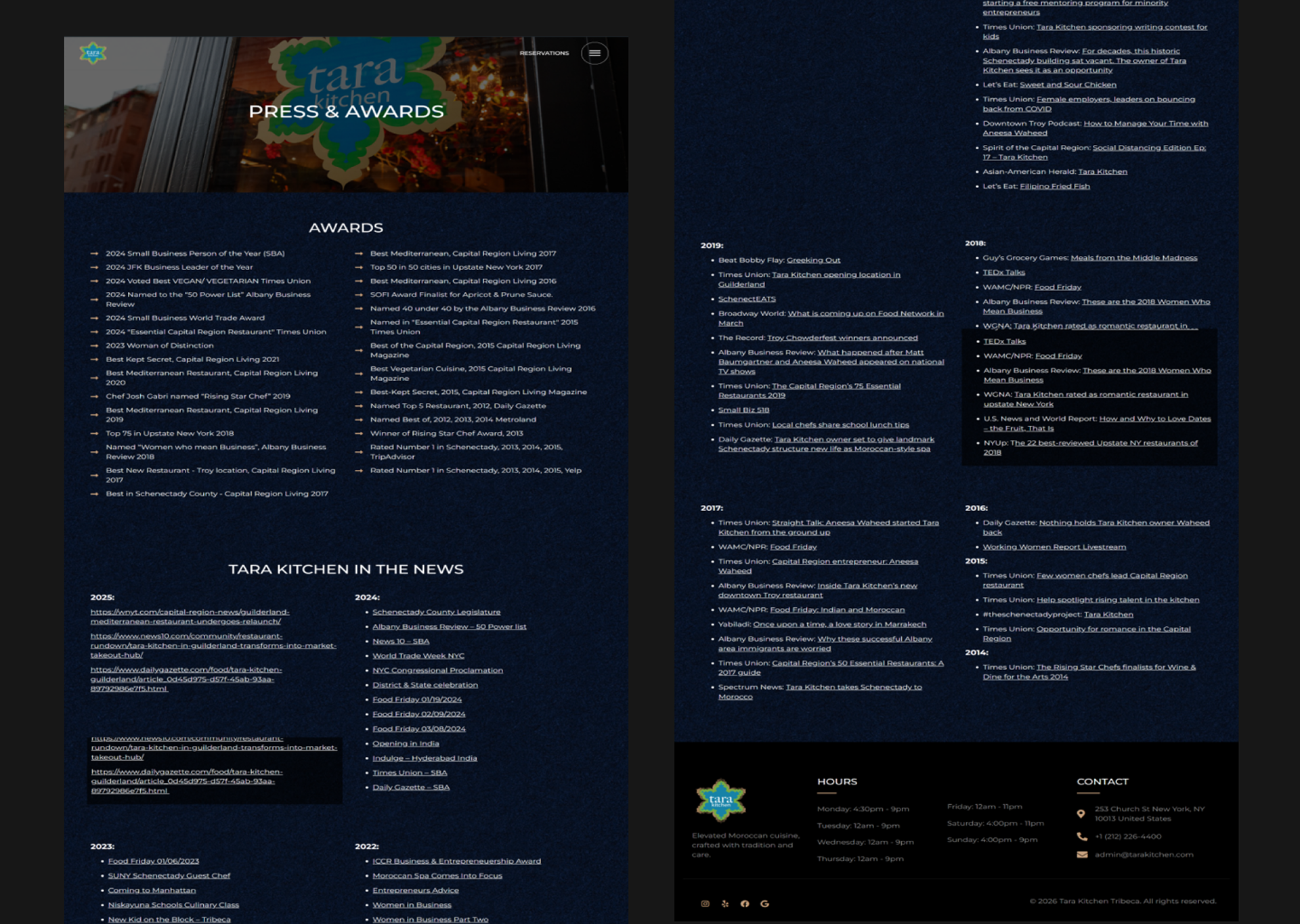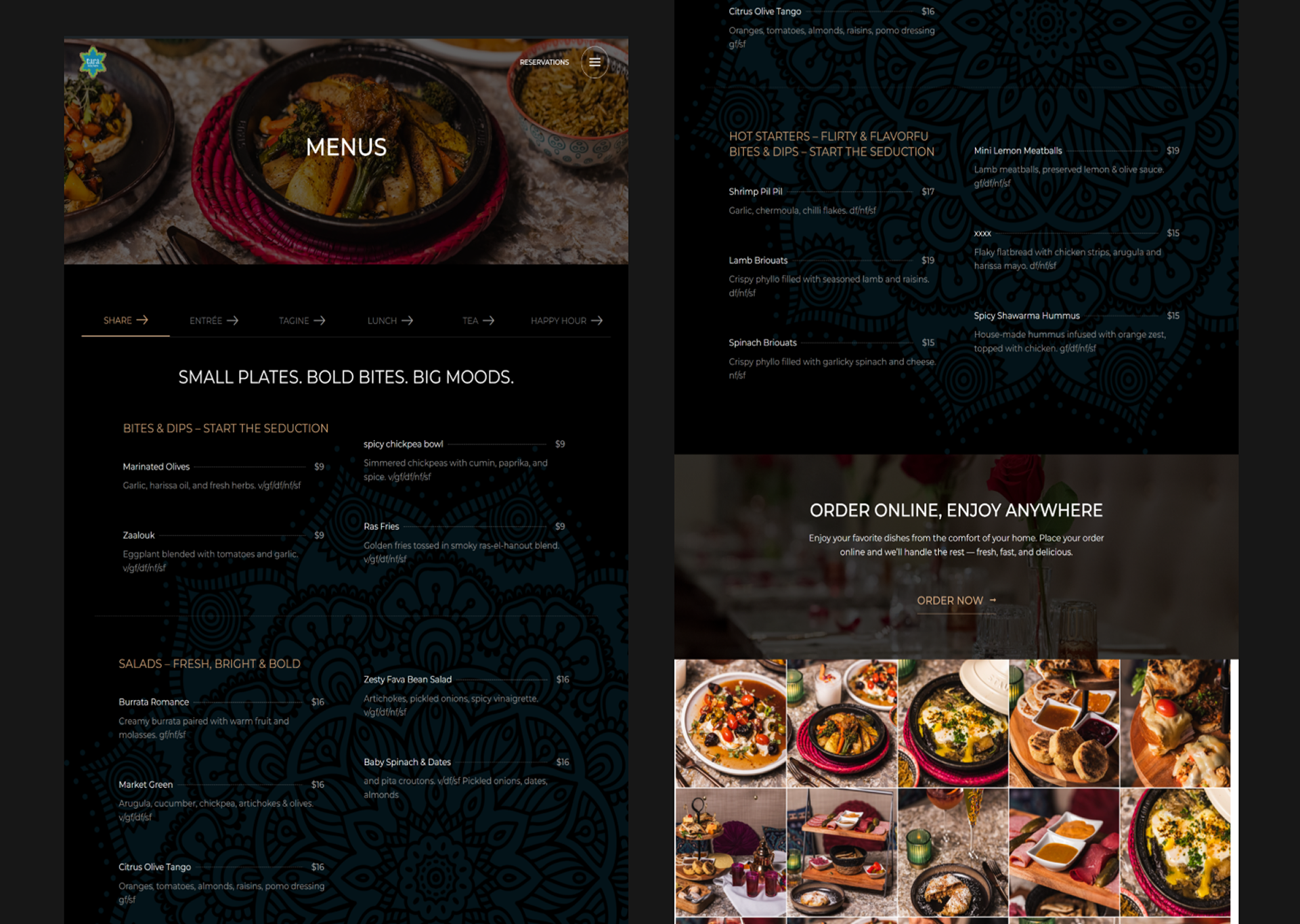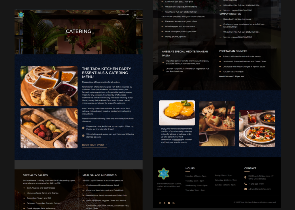 Tara Kitchen is a contemporary Moroccan restaurant founded by executive chef Aneesa Waheed, whose work has helped bring Moroccan cuisine into the mainstream through an accessible, modern approach. This project involved designing a visually engaging, user-friendly website that tells the brand’s story, highlights the Tagine experience, and simplifies menu exploration, online ordering, and event bookings—creating a warm, intuitive digital experience rooted in Moroccan culture.